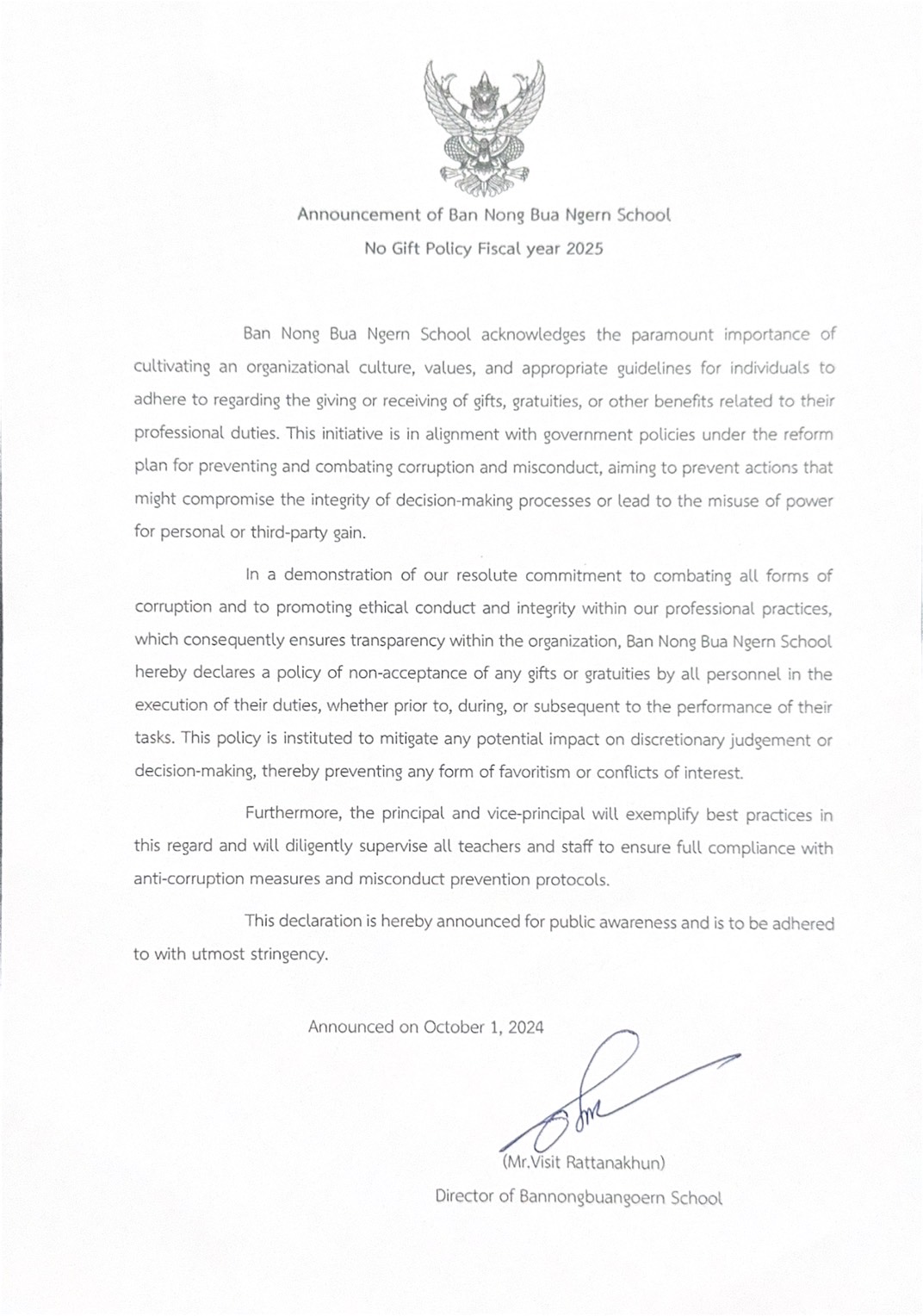 หมวด : ประกาศเจตนารมณ์นโยบาย No Gift Policy จากการปฏิบัติหน้าที่